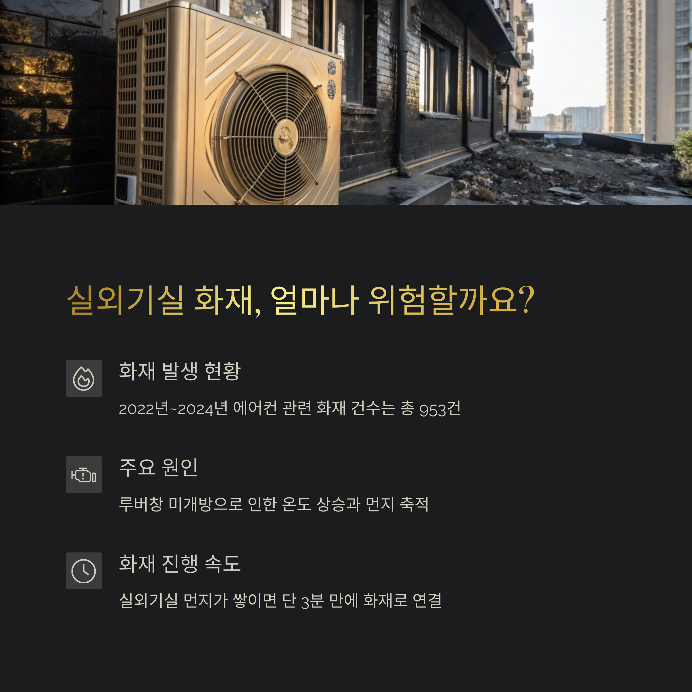 역대급 긴 폭염과 열대야가 지속되면서 전국 공동주택에서 에어컨 실외기 화재가 잇따라 발생해 주의가 필요하다.