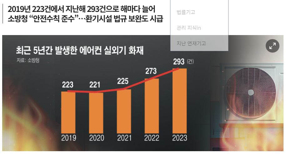 소방청 화재통계연감에 따르면 지난해 에어컨으로 인한 화재는 293건 발생했다. 보일러, 전기장판, 선풍기 등 계절용 기기 중 가장 높은 수치다. 에어컨 화재는 2019년 223건에서 2022년 273건으로 해마다 늘었다. 이로 인해 최근 5년간 10명의 사망자, 82명의 부상자가 발생했다. 총 재산피해액은 69억 원이 넘는다.